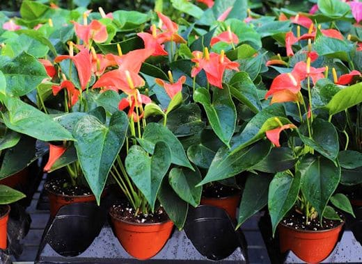 This is miniature form of Anthurium with many long-lasting waxy red blooms.
