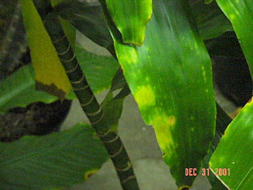 Sick Plants Losing leaves rapidlyInterior leaves turning yellowA very root-bound Ficus treeThis plant needs to be repottedA wilted Peace lilyA Ficus tree with scale insectsA palm showing nutrient deficiencyParlor palm with nutrient deficiencyParlor palm with spider mitesA dracaena with fluoride damagePothos ivy with mealybugsInsufficient lightCorn plant with fluoride damage